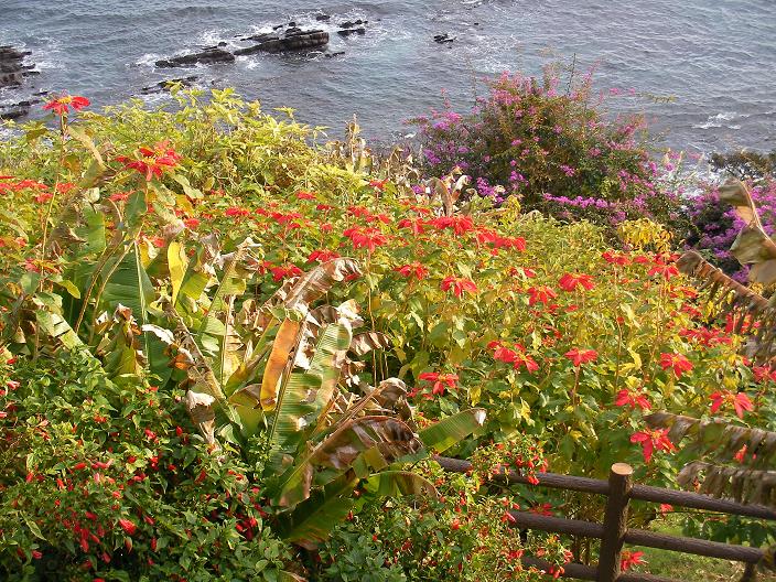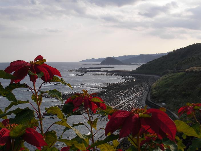 海と鬼の洗濯岩とポインセチア。